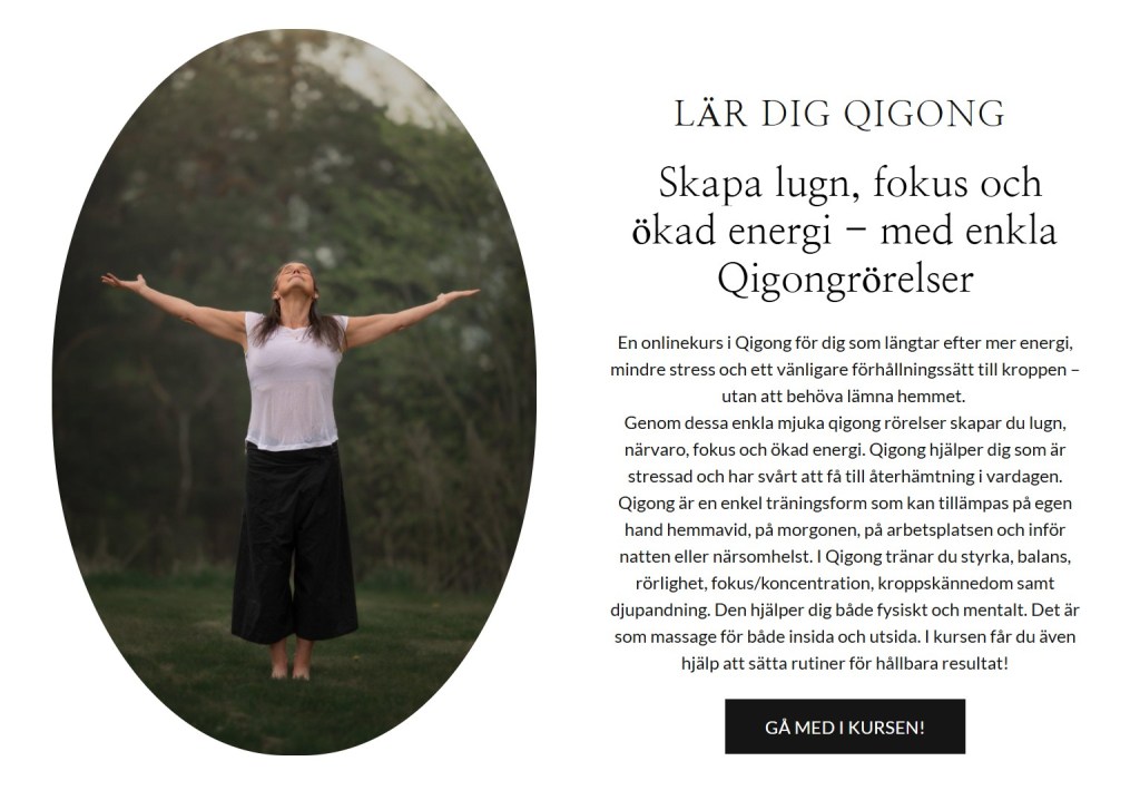 Jag kom i kontakt med Qigongen i början av 1990-talet och yogan i början av 2000-talet. Det var Qigongen som ruskade om mig rejält, den fick mig att få kontakt med mig, med min kropp och mina känslor. Qigongen är en flera tusen år gamma träningsform och är grunden inom kinesisk medicin som man förr utförde i syfte att behandla och förebygga olika sjukdomar.